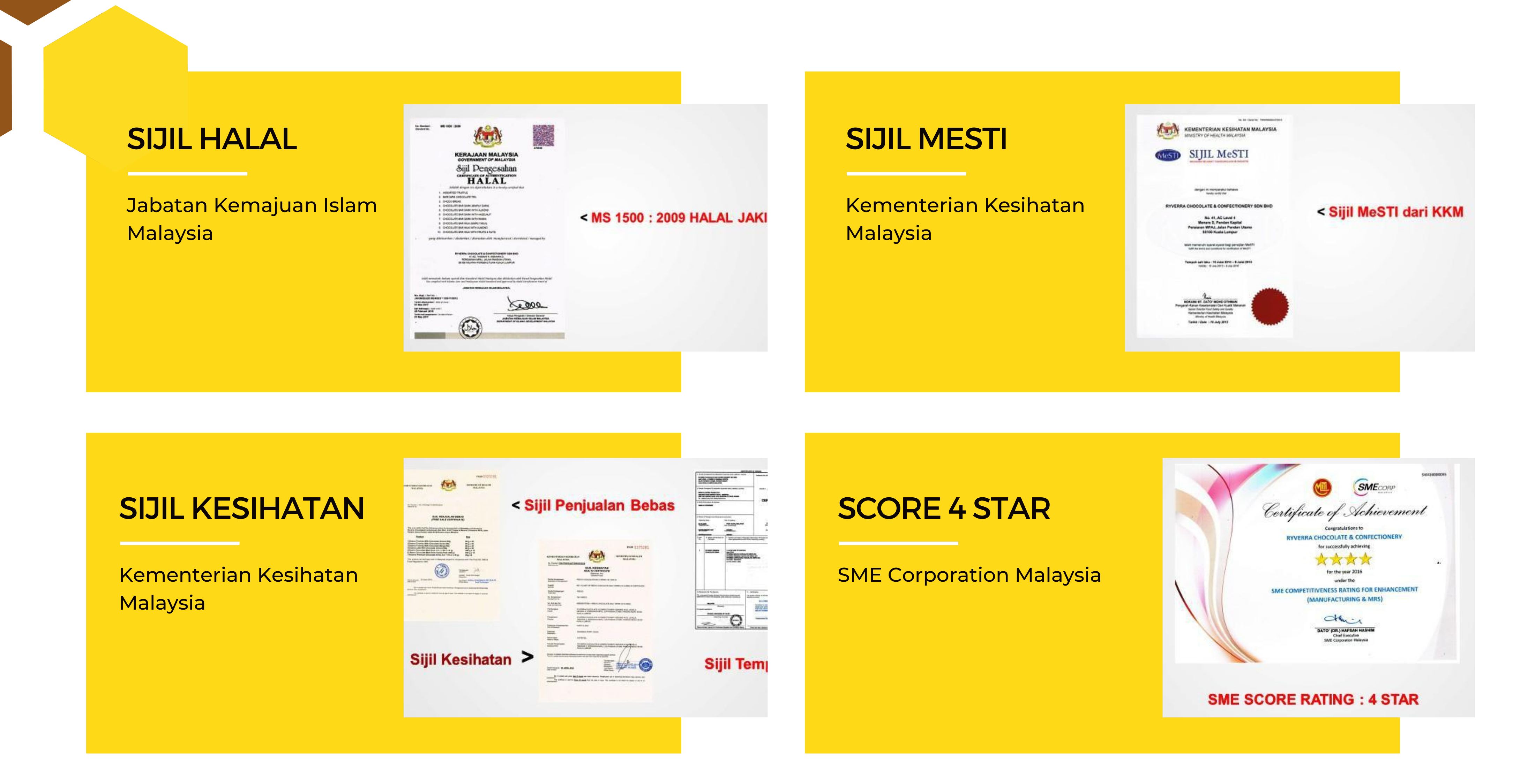 Produk yang kami tawarkan diproduksi di dalam premis pengilangan yang menepati piawaian HALAL JAKIM & juga Kementerian Kesihatan Malaysia (KKM) menerusi pensijilan Halal & juga MeSTI. Ryverra mengeluarkan produk di bawah jenama Ryverra-yang bukan sahaja merupakan coklat berkualiti premium malahan ia juga dianggap sebagai lifestyle.